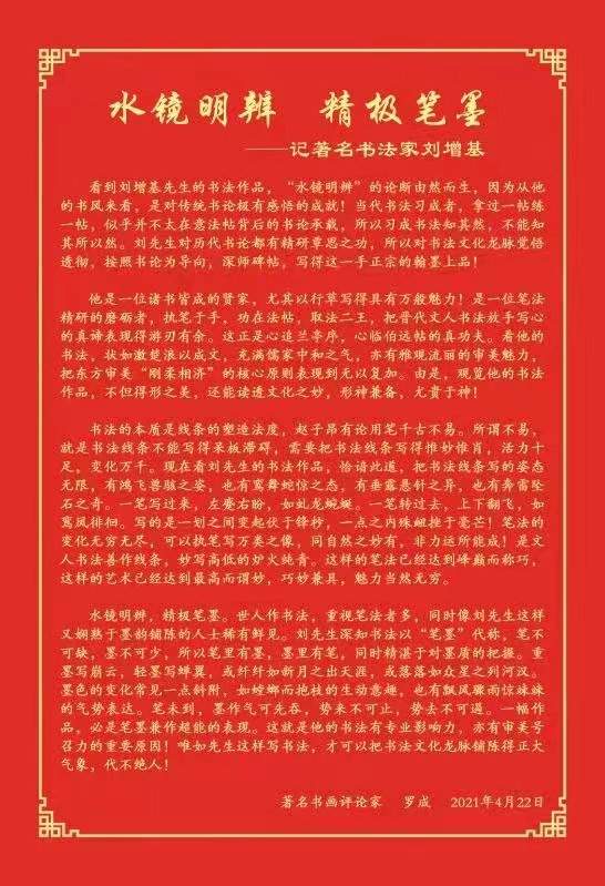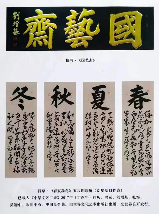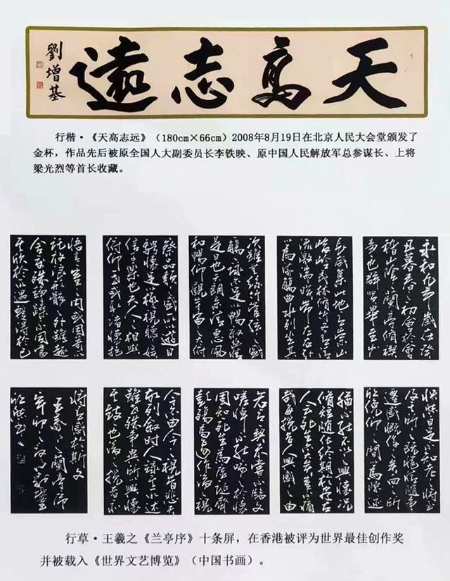 中国艺圣·刘增基 从六岁始,刘增基被父亲握着小手学写字。六十年 来,废寝忘食、夜以继日,踏看月光、迎着朝霞,不离现田、辛勤耕耘!冬练三九、夏练中伏,冒酷暑、战严寒,以继承和发扬祖国优秀文化传统为已任!以柳(公权)《玄秘塔》正楷为宗,遍临欧(阳询)《九成宫》、颜(真卿)《东方朔西赞》、赵(孟额)《胆巴碑》诸碑帖,得其欧之险劲、颜之浑厚、柳之挺拔、赵之雍容,坚持晋朝王羲之老师--卫夫人“多力丰筋者圣、无力无筋者病”的学书方针;记当代艺术大师,真、草、隶、篆书法集大成者邓散木先生“先与古人合,后与古人离”的学书教诲。广泛涉猎、上下求索,在中国书坛卓然独步,自成一家,四十年来,天南塞北、扬我国粹、驰骋九州、广交益友!足迹踏遍祖国大江南北、长城内外,转益多师,受益匪浅,受到中国社会各界领导、同道和亲朋好友的普遍认可和赞赏!先后被评选为“中国艺术博士”、“新时代中华诗状元”、“共和国功勋文艺家”“中国终生艺术泰斗”、“世界文艺百家领军人物”、“艺坛骄子”、“十九大功勋艺术家”、“金砖艺术家”、“金牌艺术家”、“国家高级书法师”等职称,并被国家授予“中国书法艺术楷模”、“当代艺术楷模”、“中国最具投资价值艺术家”、“中国最具收藏价值艺术家”、“国家文化卓越贡献奖”、“中国国际艺坛巨匠”等荣誉称号!刘增基与何香凝、齐白石、常香玉、萧龙士、郭沫若、徐悲鸿、启功、范迪安、苏士澍十位艺术人师一起被载入《一代巨擘》。刘增基与王羲之、欧阳询、苏轼、黄公望、董其昌、石涛、张大千、启功、冯远十位艺术大师载入《大师风范》。2020年3月,刘增基先生荣获第三届世界文化奖金奖,先后被授予《世界艺术巨匠》和《世界艺术泰斗》荣誉称号。