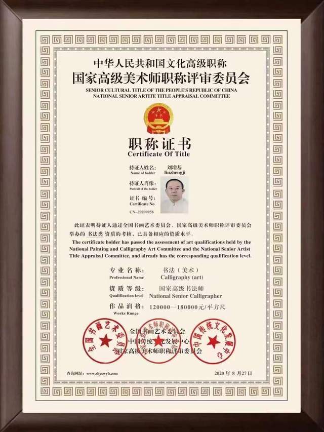 2020年鉴于刘增基先生艺术水准,在全球艺术界与艺术市场的影响力与认可度,特评定荣获“全球艺术投资巅峰奖”并授予“全球最具投资价值与收藏潜力艺术家”荣誉称号。2020年8月27日全国书画艺术委员会、中国传统文化发展中心、国家高级美术师职称评审委员会举办的书法类资质考核,刘增基先生被评审为“国家高级书法师”。作品润格审定为120000--180000元/平方尺。2020年12月,鉴于刘增基告生在世界文化中有着巨大影响力,作品极具文化传承代表性,深受世界人民喜爱,被比利时皇家艺术院聘请为“终身院士”和“荣誉教授”,并授予刘增基先生“中欧文化形象大使”荣誉称号。