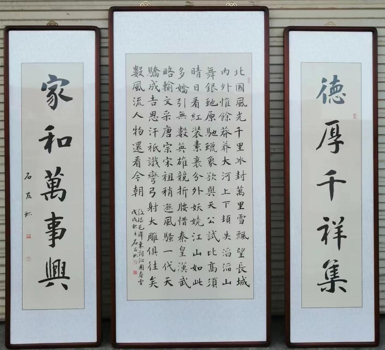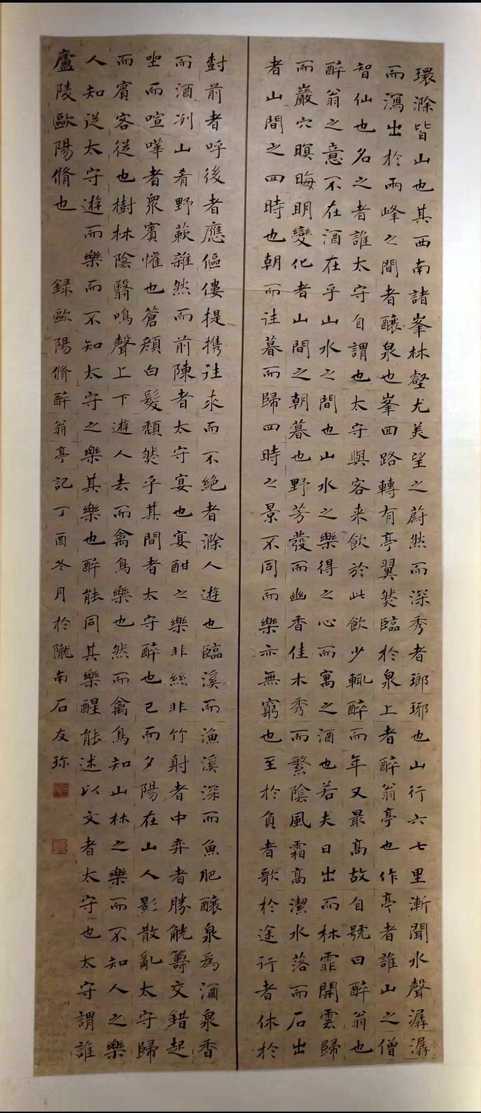 石友珍先生的书法习成有诸书皆成的宽度,作为一名优秀的书法教育者,他的楷书写得法度精详,无可挑剔,这一手金书锦字,完全是书法教育家必需的资粮,难怪他从事书法教育令人万分折服!石友珍的楷书历练,从魏碑的方笔作起点,有精习阴符经的丰姿多神,比如《醉翁亭记》。又取欧楷的险笔生动,参意颜筋柳骨,比如《沁园春 雪》可以化历代法帖之精化为我所用,剔除楷书创作的呆板习气,把楷书写得上下非齐平,左右非方整,平曲有别,高低有趣,稍带隶书的圆活生动劲儿,完全不是印刷体的僵化,最有书法艺术的核心属性,形神兼备,尤贵于神!