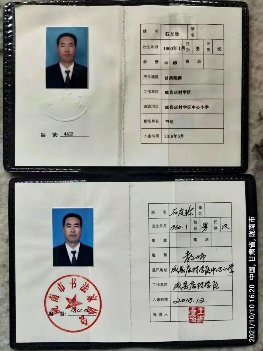 石友珍,男,汉族,1960年生于陇南成县,斋号阅溪草堂,中小学高级教师职务,在职书法教师。甘肃省书协会员,陇南市书协会员。甘肃省宣传部省文联"翰墨扶贫”优秀志愿者:成县政协书画院特聘书画师。