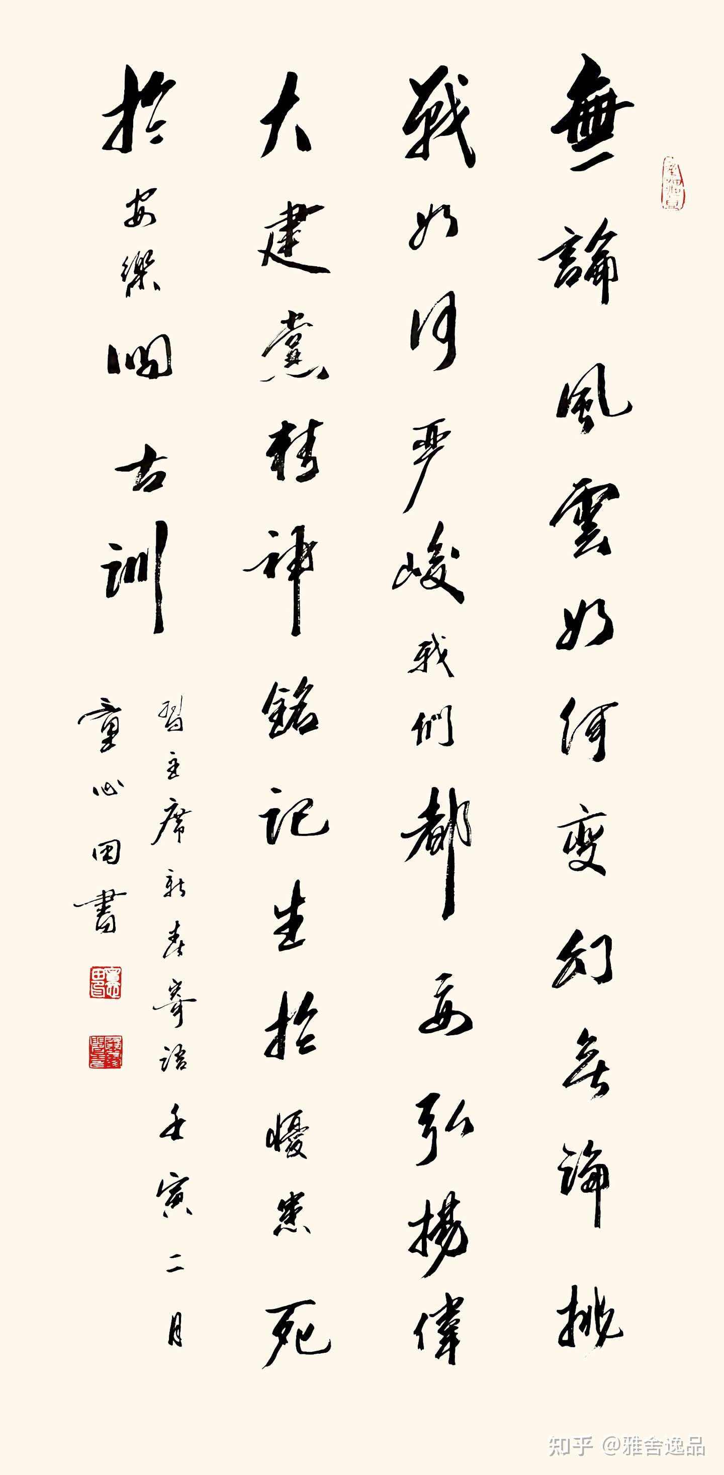童心田先生在进行书法创作时,总是带着觉察力去把握书法艺术的出发点和落脚点,从内容到形式,都注重为人民而书。总是以独特的视角,生动的形式去感染人民,鼓舞人民,让人民喜闻乐见。