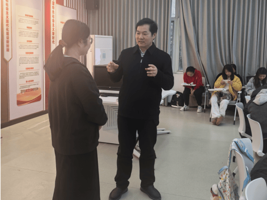 11 月 6 日下午,驻马店职业技术学院校党委书记苏新留深入教学一线,实地调研思政课教学开展情况,随机听取了马克思主义学院杨朵老师主讲的《道德与法治》课程,并在课后与同学们面对面交流,引导青年学子坚定理想信念,明确时代使命。