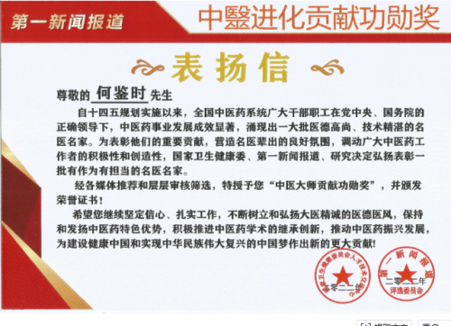32. 中毉进化学传承带头人何鉴时简介 何鉴时(又名何奋明、何凤鸣)男,1944年7月23日出生,甘肃省武山县咀头乡何窑村人,中共党员,转业军人,1992年晋升为主治医师。1963年在原籍办学任教,1964年应征入伍,1974年转业到新疆第二工人疗养院。 坚定不移的贯彻落实马克思主义中国化的毛主席和习主席为核心的党中央的英明决策,完成了对习近平新时代素质教育的中毉进化学,攻克了药费报了命也报了等诸多难题的开创性研究。如《中国对人类做出最伟大贡献的结论--所有人提前死于对抗党中央的反映》为题的汇报。是把实现中华民族伟大复兴的中国梦的宏伟蓝图,贯彻落实到:在全球造就七十亿不得病,得了病自愈的最高明医生的培训培训教材。首先荣获新疆1、2、4届自然科学优秀学术论文奖。又被选入50多种大型学刊、会刊、辞书、文库和中国“十三五”文化发展重点出版项目。荣获习主席、江主席、胡主席和温总理等党和国家最高领导人的题词,于2019年1月印刷。赠送国家领导人,和世界各国驻华大使馆,接着在一万多个网站不断向国家领导人汇报,正在向全民大众普及和推广中,荣获中共中央党校、国务院研究室、中共中央宣传部、中共中央组织部、国家人才资源和社会保障部、国家卫生与健康委员会、国家中医药管理局、新闻部门和学术团体的高度评价(见附件)。 根据当前仅仅依靠引进西方的应试教育医学培养出来的,包括博士生导师在内的几乎所有学者,都不能解决人到七十岁时,百分之五十的脑细胞死亡;也都不能解决溶酶体中各种类型的水解酶,把长期不用的正常组织被水解、破坏和摧毁人的自组织进化机制。特别是新疆去内地疗养的职工,因受气候、环境、生活习惯等不适,往往是轻病变成重病后,重病患者死于长期旅途。引起新疆维吾尔自治区总工会的主管领导,在新疆第二工人疗养院组织召开的疗养工作会议,决定要大力发展新疆的工会疗养事业的精神。引起了何鉴时对传承中毉进化学,和捍卫唯物辩证法的实践总结。完成了新的太阳系和生命起源;新的地震与极端天气突发事件的成因和防治措施;新的病因病机和防灾减灾机制。是完全依靠自然法则和生命规律的中国天道的十大逻辑定理,才能够“尽终其天年,度百岁乃去”。这就是对实现人类一代比一代更聪明、更健康、更长寿和更幸福的传承精华守正创新。结果到今年81岁时,体力和精力增加到:能够连续做完365个下蹲的周天数。每天做一至三组。证明了中毉进化学,是唯一能够让人到八十岁时不是老年,是壮年的人类最原始、最超前、最重要、最易普及和更深层次的操作方法和要领。 由自治区编委批准,于1984年在本院首创本学科(当时称易毉学)教研室,免费为疗养病人治病;1989年在乌鲁木齐小十字首创本学科门诊、研究中心、学术小报和专业技术培训部,通过对宇宙生成演化语言和生物遗传进化规律的先天万象易,在六图表中揭示了中国天道的十大逻辑定理的研究,证明了“盘古一炁化三清”的民族信仰,伏羲画卦创易的世界观,黄帝问道广成子等天师的操作方法和要领,说明了中国圣贤之人,是把由带电粒子中最重的质量物质设为“阴”,在人体为“精”;最轻的能量物资为“阳”,在人体为“气”,由质能互制的阴阳合体产生新秩序的比重分层演化中造天、造地、造山、造海、造人和造万物的信息增值量设为“道”,在人体为“神”;“神”是造物规律造化了万物之灵的人类,本身具有接收、储存和处理人和万物信息库的大脑功能。用精气神统一协调和相互作用的中毉进化学“治未病”“治病必求于本”“尽终其天年,度百岁乃去”的万能手术刀,开发利用人类本身具有的无限潜能,才能够促成人类一代比一代更聪明更健康更长寿和更幸福。如在练成穿越时空的量子生命动力学总信使,把灵魂升华成为现代科学证明的量子纠缠群体效应的心灵盛宴艺术,随时随地都能够为自己治病,和在治病救人中化敌为友,造就七十亿不得病得了病自愈的最高明毉生。如广成子在一千二百岁时向皇帝传道很健康的传说;舜六十一岁称帝寿高134岁、姜子牙(前1156年~前1017)寿高139岁、孔子与老子相见时老子已是268岁、彭祖(800岁)、张三丰(219岁)、李庆远(257岁)、慧昭和尚(290岁)、陈俊(443岁)。正如在没有发明治愈“非典”“新冠病毒”等特效药物的情况下,我国医学科学家们证明了只有利用康复者的血清,才能够直接杀死和消灭“非典”“新冠病毒”;央视【挑战不可能】,不断报道了开发利用无限潜能的伟大实践者;享年108岁高龄的国学大师文怀沙,由北京301医院确诊肝癌晚期后,他问专家,如此还能活多久?专家说最多一两个月。他出院后陶醉在祖国的大好河山中流连忘返,一年后再去301医院检查时,肝癌病灶不见了;由印度等地发现的狼孩,虽然本身具有人的遗传基因,但在狼群中丧失了开发人性和人的进化技能的最佳良机后,结果就成了永远再无法挽回的最大损失。历史和现状充分证明:不能违背利用自然法则和生命规律的“中国天道”;不能丧失强化人性和人的进化技能的最佳良机;不能完全依靠科学技术和宗教信仰的“西方人道”替代“中国天道”。何鉴时对新疆军区7438工厂患直肠癌的陈xx治病,是在军区总医院做完手术,因癌瘤广泛扩散无法切除,只能在升结肠做完造瘘后的连续20天,一直不能通气