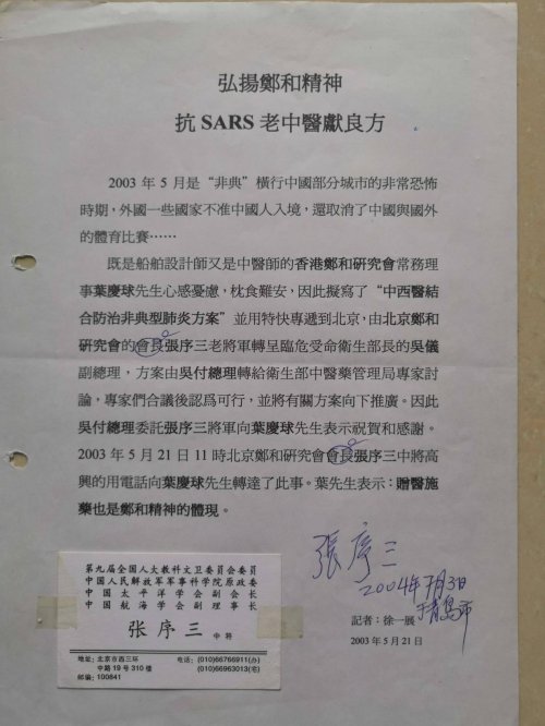 2003年“非典型肺炎”期间,他提供的防疫方法,经中医药管理局研究后,向全国推广,吴仪副总理兼卫生部部长,委托张序三中将向叶庆球先生表示祝贺和感谢!