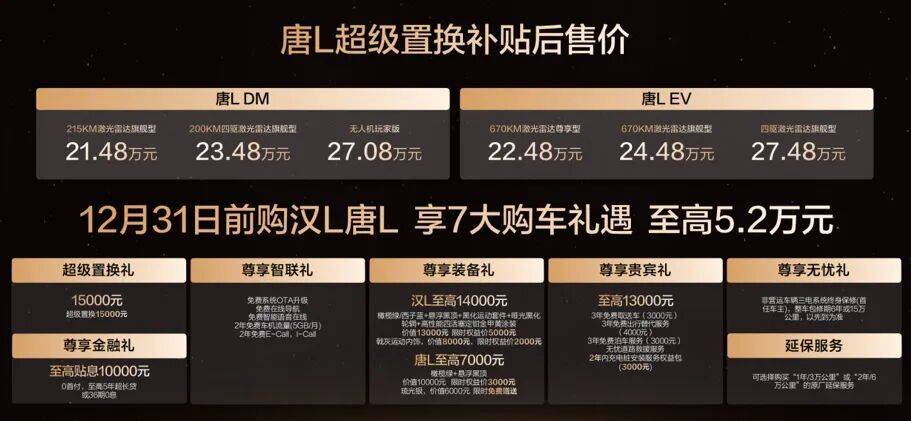此次,唐L EV 3款车型,补贴后售价22.48万~27.48万元;唐L DM 3款车型,补贴后售价21.48万~27.08万元;同时,比亚迪还为用户准备了包含置换补贴在内的至高价值4.5万元尊享礼遇,让旗舰体验触手可及。