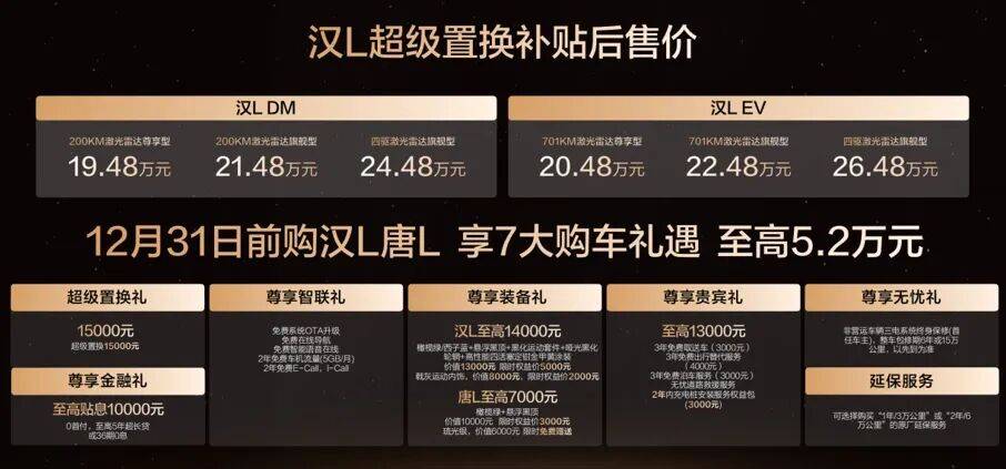 此次,汉L EV共带来3款车型,补贴后售价20.48万~26.48万元;汉L DM 3款车型,补贴后售价19.48万~24.48万元;同时,比亚迪还为用户准备了包含置换补贴在内的至高价值5.2万元尊享礼遇。(以上权益截至12月31日)