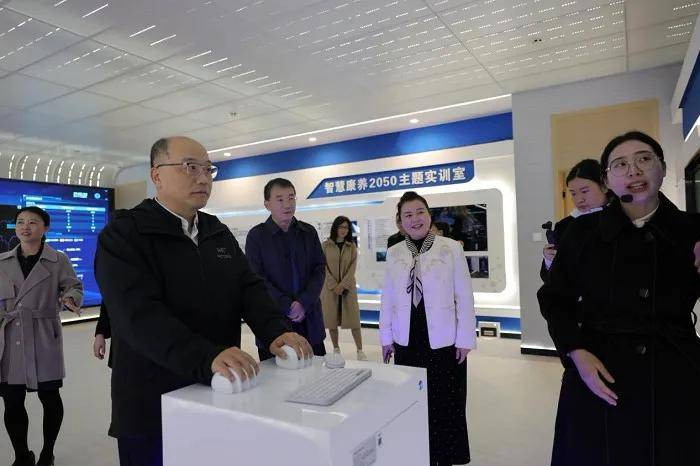 智慧化健康照护实训中心作为响应 “健康中国” 战略的核心平台,投入近千万元集成物联网、AI 大数据等技术,涵盖八大功能板块,实现 “学、训、赛、考、研、创、用” 一体化,该实训中心是眉山药科职业学院与慧医(天津)教育科技有限公司校企合作、产教融合的标杆成果。考察组现场观摩学生实操,体验中医脉诊、中药香囊制作、艾灸等特色项目,对技术赋能与康养服务深度融合的模式给予高度评价。
