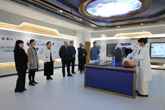 11 月 16 日下午,国家开放大学党委副书记徐明军携国家老年大学资源平台中心主任王硕、直属学院院长刘彩梅等一行,在眉山药科职业学院常务理事长左小刚、校长卢敏等陪同下,先后考察了学校中医药博物馆、智慧化健康照护实训中心与德国思灵机器人实训中心。