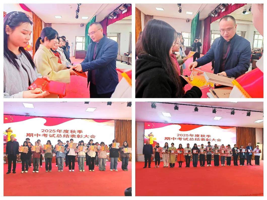 在热烈的掌声中,秦磊等学校领导依次为获奖师生颁奖。“总分荣誉”奖表彰了各班前三名同学,他们凭借扎实的学识与不懈的努力脱颖而出;“单科状元”奖覆盖语文、数学、英语、基础学科及各专业学科,彰显了学生的学科特长与综合素养;“优秀教师”奖的颁发,则是对教师们辛勤付出与教学成果的高度认可。