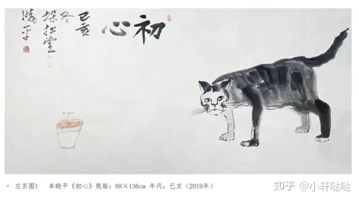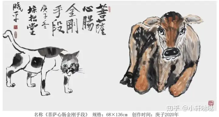他用新文人画的写意手法画动物尤擅画猫。他的画受哲学思想和传统文化及国画道法影响深厚,艺术语言独到、个性特色突出、另辟蹊径、独树一帜。其画风简扼率真、自然洒脱、阳刚雄渾、大气凝重、精气神兼备。他用笔用墨恣意随心,走质朴、钝拙、老辣、生涩、野逸一路,不喜不媚不甜自成一格。