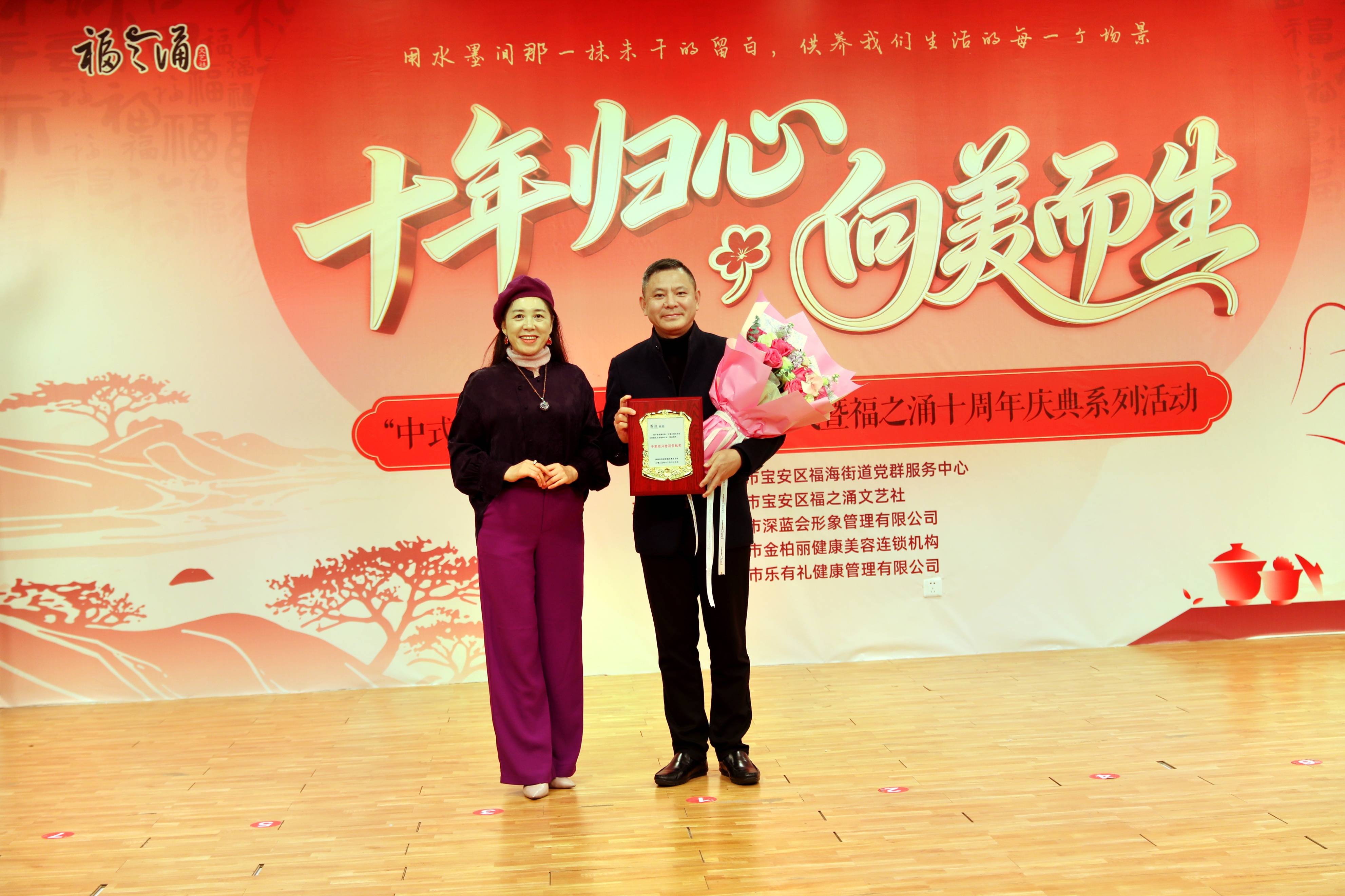 活动期间,福之涌文艺社对十年发展历程中贡献突出的个人与单位予以表彰。王耀美、梁红兵、王显召、谢志强、罗文娟、欧阳凤雪、张艳、马湘、朱雪丹荣获“特别贡献奖”;深蓝会形象管理有限公司、深圳市点印图设计有限公司被授予“战略合作伙伴单位奖”;李启华、高安玲、梁燕、代家波、余天富、彭志芳、黄秀帆、马燕、郭双艳、陈利华、王婵媛、谢星明、曹秋云则获得“优秀骨干奖”。