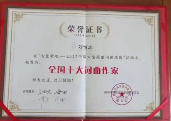 因创作海军新时代军歌《走向深蓝》而成为“走向深蓝”一词发明人,在《感动中国》人民喜爱的艺术家全国听(观)众群众性评选中,凭借《走向深蓝》(霍勇演唱)、《海军蓝》《大海誓言》(吕继宏演唱)、《领航新时代》(刘丹丽演唱)、《撸起袖子加油干》(何沐阳曲、周深等演唱)、《农民父兄》(春雷演唱)、《我们是英雄护航兵》《奔向海洋-海军士官学校校歌》《我们一同走过从前》(康澎曲 董文华演唱)、《战士·界碑·祖国》(于乃久演唱)、《伴你人间天地情》(杜克曲 白雪演唱)、《军旗情》(朱虹演唱)、《更多的时候》《足迹》(楚兴元曲、杨洪基演唱)、《光照四季》(莎光曲 谭晶演唱)、《丽江酒歌》(许镜清曲、阎维文演唱)、粤韵歌曲《领航新时代》(刘恒志作词,陈仲琰、卢华作曲,叶幼琪演唱)、《启航》(万山红演唱)、《永远青春的中华魂》(戴玉强、黄华丽演唱)等,荣获“中国十大词曲作家”称号。