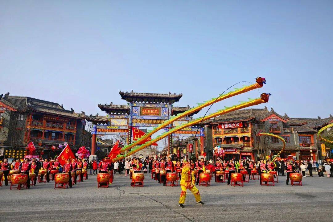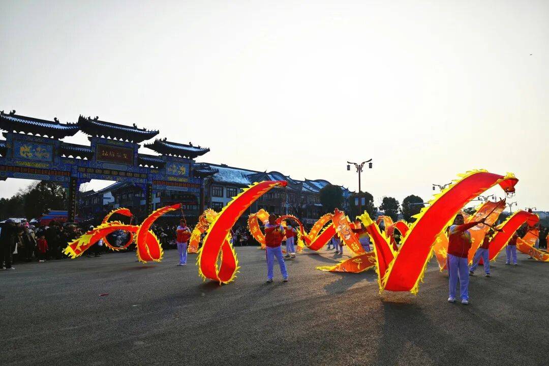 喜庆的锣鼓声震天响,百名鼓手敲击大鼓,激昂顿挫的鼓点响彻云霄,彩带龙跟着节奏灵动翻腾,龙头高高扬起、龙尾顺势摇摆,时而盘旋升空如腾云驾雾,时而俯冲落地似探水寻珠,瞬间将节日的热烈气氛拉满。
