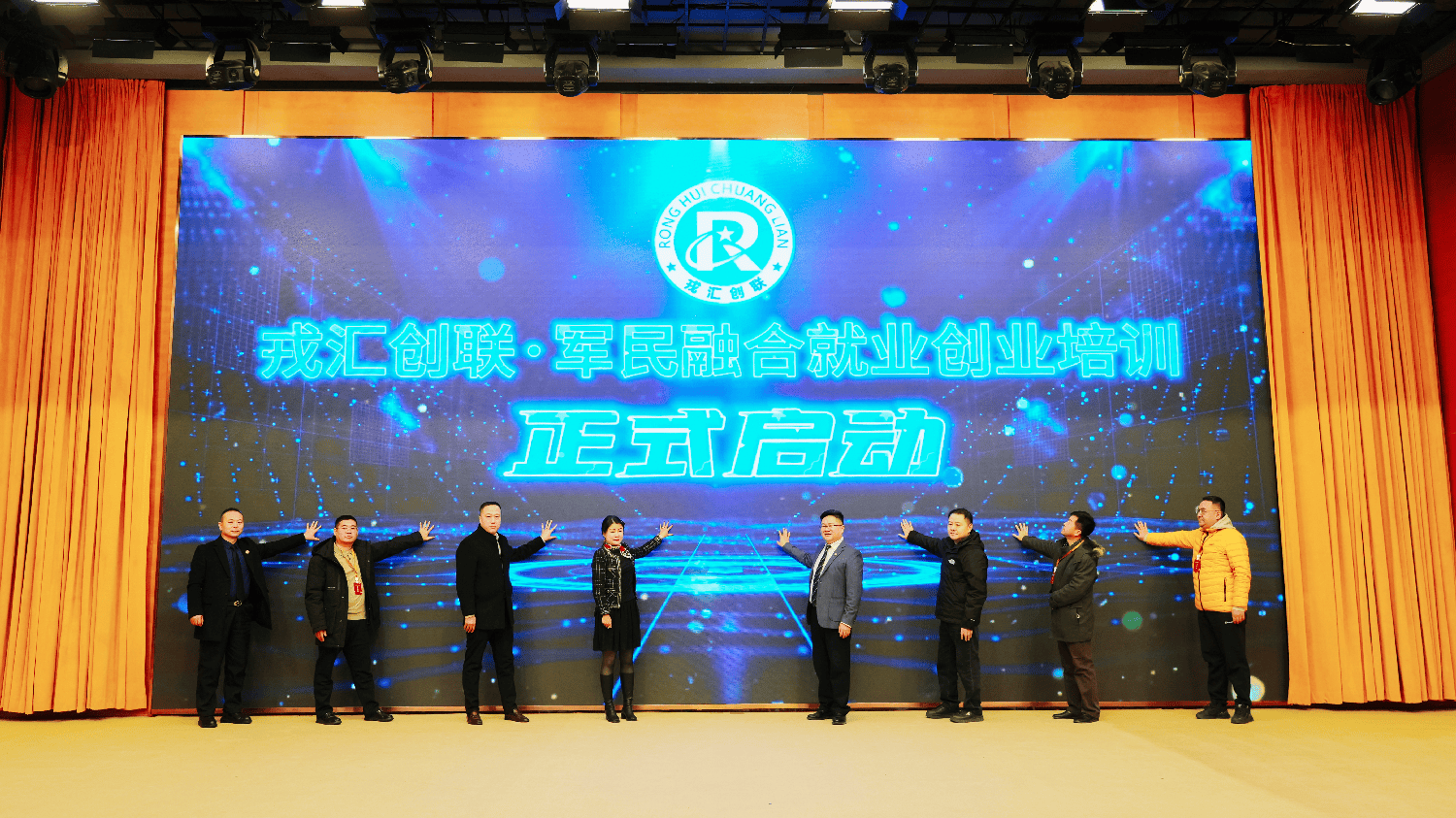 由北京德信行投资有限公司副总裁赵起超,北京国轩资本管理有限公司投资总裁陈鸿道,戎汇创联执行总裁魏镇,戎汇创联战略架构师潘博谦,中国工商联农业产业部外联部韩长印,北京君雅香馨国际贸易有限公司杜乙禾,亦自然文化艺术发展(北京)有限公司董事长周剑登台,共同按下启动按钮。戎汇创联“军民融合就业创业培训”项目正式启动。