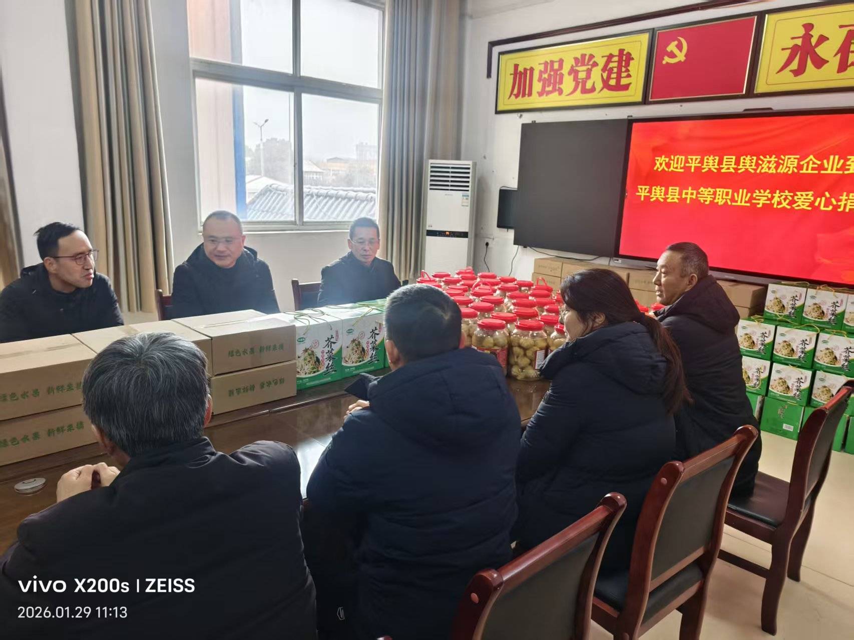2026年1月29日上午,河南省平舆县中等职业学校校园内暖意融融,本地知名网红、平舆县舆滋源食品有限公司负责人小观带着满满诚意走进校园,向学校捐赠水果、芥菜丝、水晶糖蒜各50件,共计150件爱心物资,总价值近6000元,用实际行动为职业教育发展注入温暖力量。