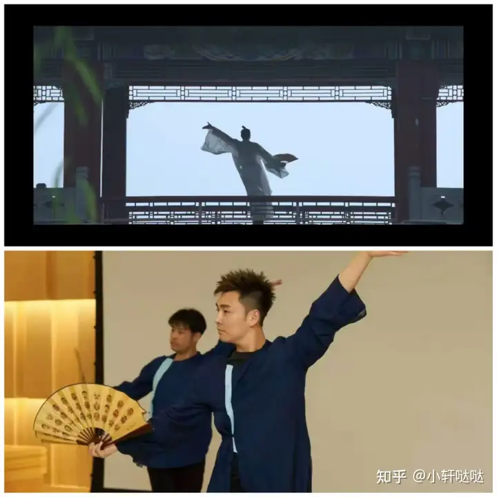 上:男子折扇舞蹈“春晓”,左手汉画砖鸟形图像,右手折扇示意鸟尾,在颐和园昆明湖北京市海淀区文委“三山五园”宣传片中,震撼开场。