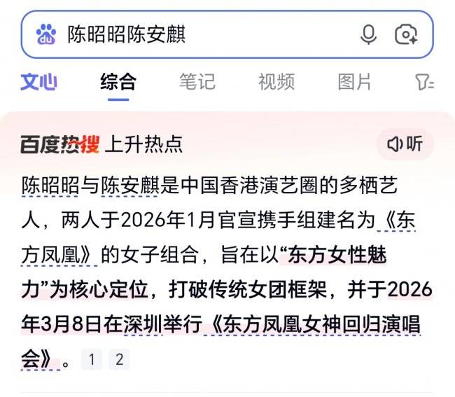 据百度热搜官方信息显示,陈昭昭、陈安麒已于2026年1月正式官宣,携手组建全新女子组合《东方凤凰》,并已定档2026年3月8日女神节,于深圳举办《东方凤凰女神回归演唱会》,消息一经发布便冲上热搜上升热点,成为大湾区开年最受期待的演唱会IP。