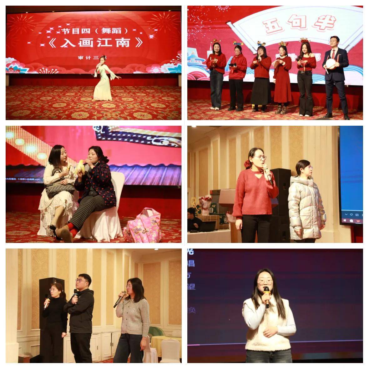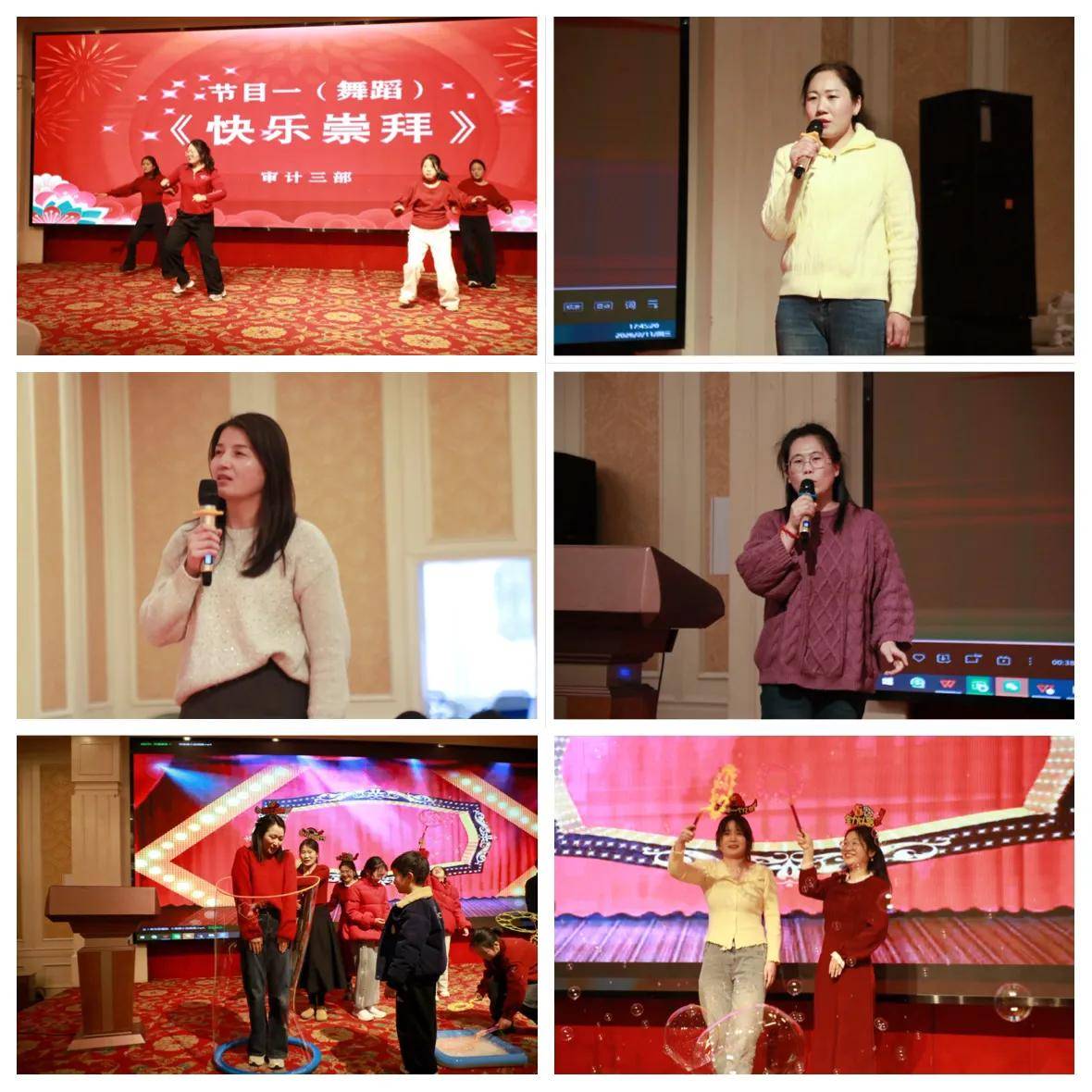 年会文艺汇演精彩纷呈、高潮迭起。审计三部带来活力四射的舞蹈《快乐崇拜》与温婉雅致的《入画江南》,审计五部深情演绎歌曲《樱花草》《天地龙鳞》,市场部献上励志歌曲《阳光总在风雨后》与趣味小品《你有我也有》,审计六部唱响经典曲目《后来》,审计一部带来创意十足的《审计行业五句半》与全员舞蹈《舞蹈泡泡秀》。形式多样的节目充分展现了32业务部员工多才多艺、团结向上、朝气蓬勃的精神风貌,赢得全场阵阵掌声与喝彩。