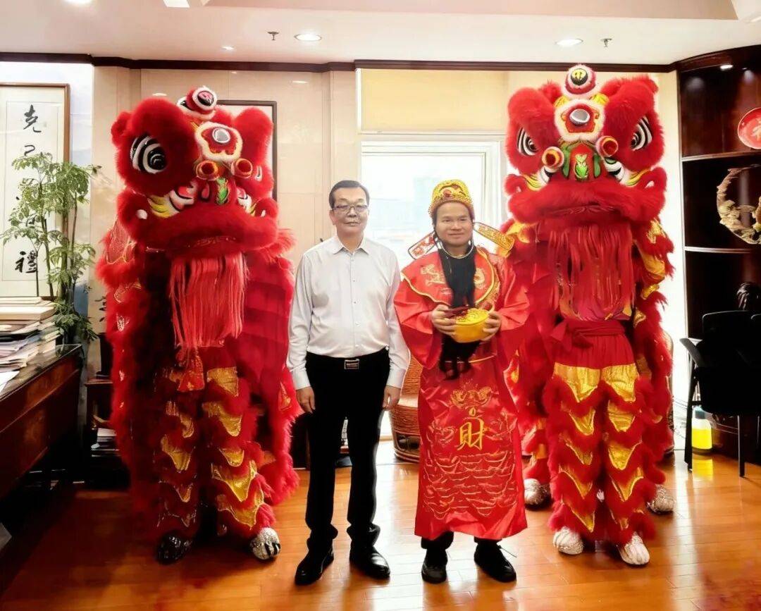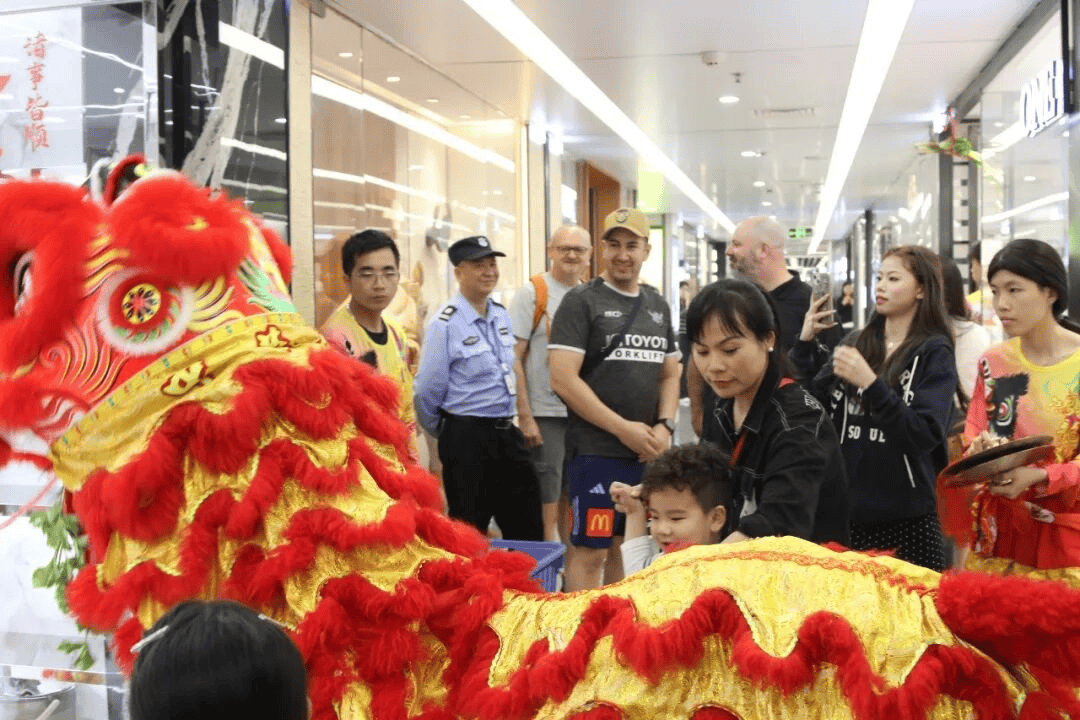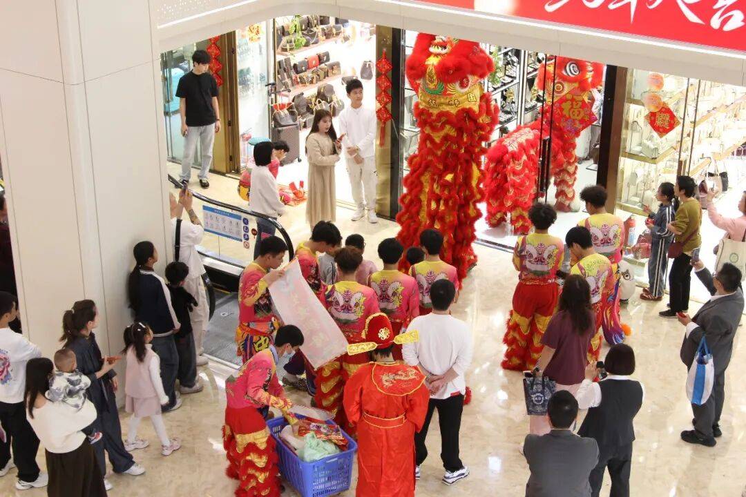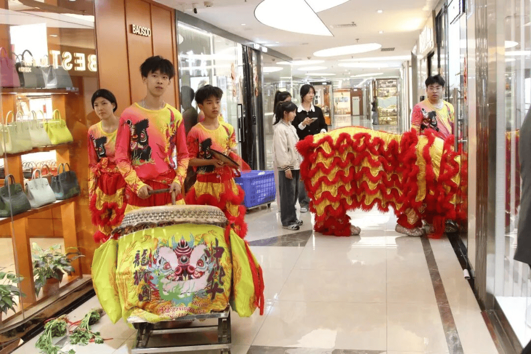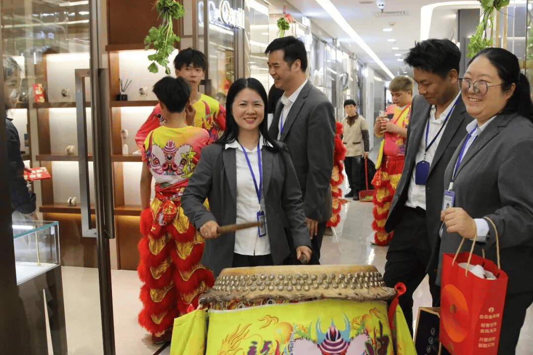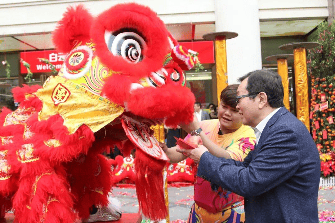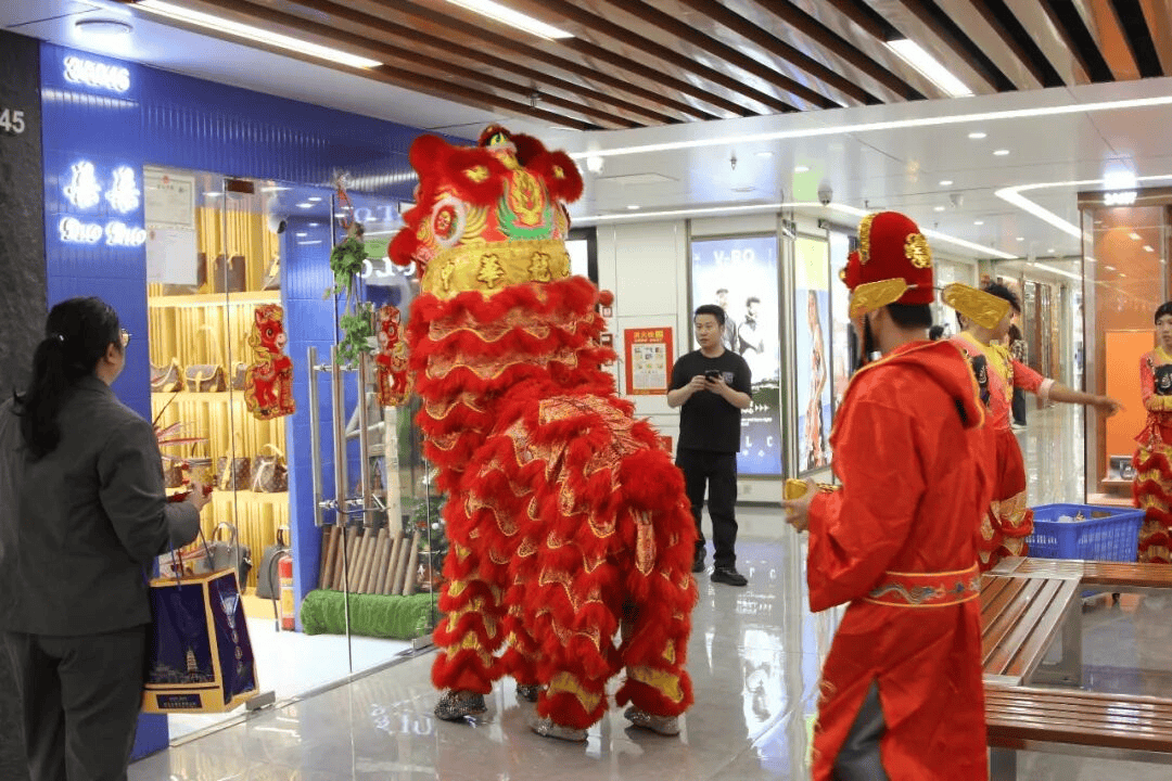 舞狮表演结束后,广州白云皮具城客服部引导醒狮队来到白云皮具城时尚中心、轻奢中心及写字楼给商户拜年,工作人员给商户派发新春红包,送去新春的祝福,祝愿广大商户朋友在新的一年再创佳绩。