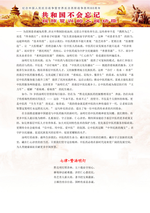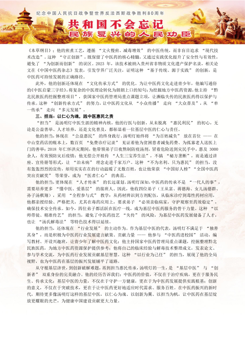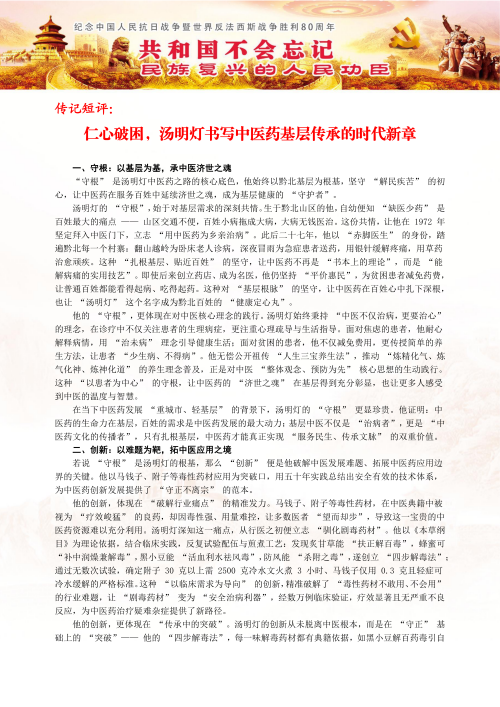 从赤脚医生到国医大师,中国中医传承人,全国各老中医汤明灯用一生诠释了“医者仁心"的深刻内涵。在他身上,我们看到了中医药文化生生不息的力量-既有《黄帝内经》的智慧传承,又有与时俱进的时代创新:既有悬壶济世的悲悯情怀,更有民族复兴的文化自信。正如《中医药理》扉页所题:"传承不泥古,创新不离宗。"这位大山里的苍生大医,正以其坚定的步伐,走出一条中医药振兴发展的康庄大道。