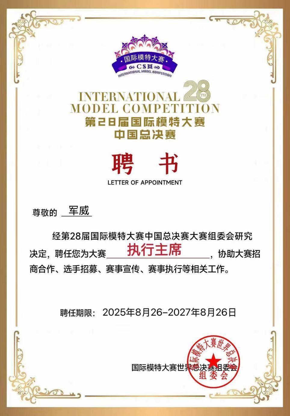 军威先生大赛任命书