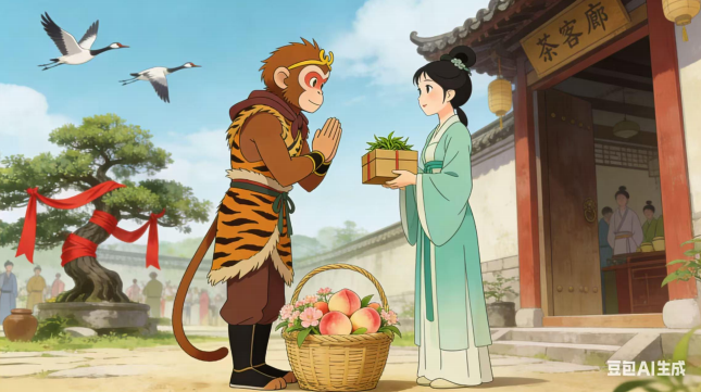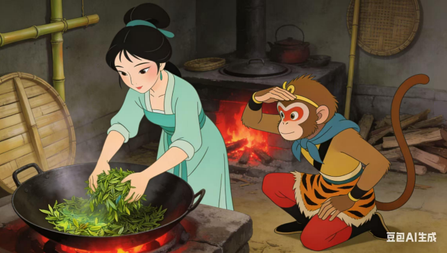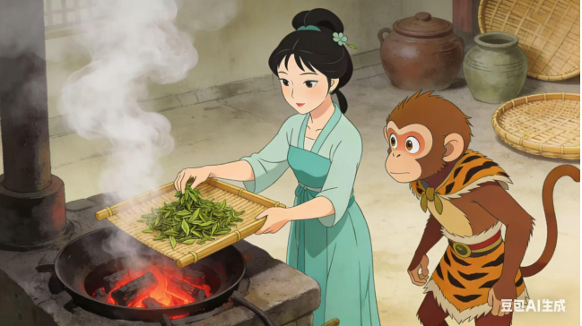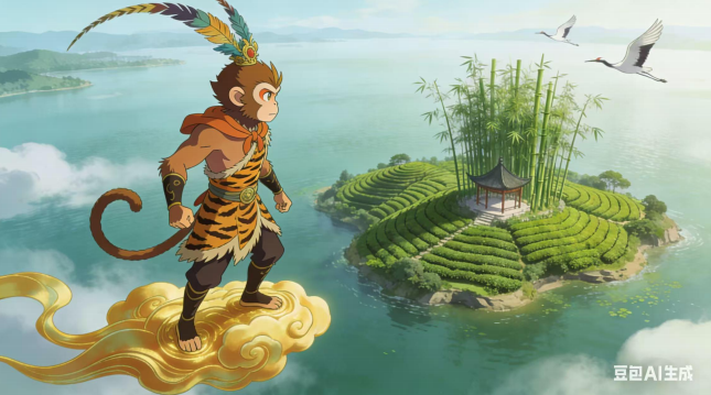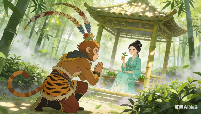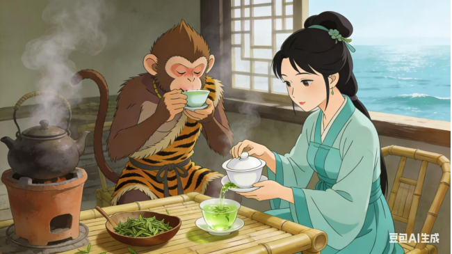 (三)猴哥不敢迟疑,翻筋斗云,穿云破雾,一路向西,直至洞庭湖君山岛。岛上烟波浩渺,茶香漫山,他循香而行,见一青衣茶姑坐于竹亭,素手捻茶芽,仙气袅袅。猴哥上前躬身:“仙姑在上,弟子花果山孙悟空,奉菩提祖师之命,前来求拜学艺,求长生之法。”