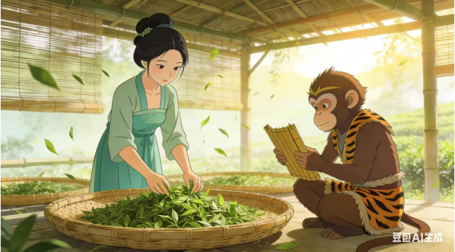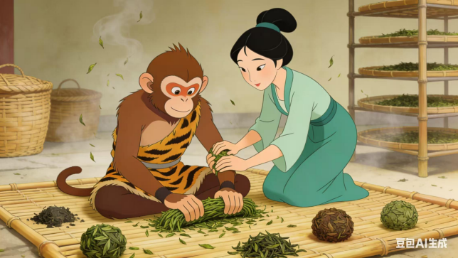 (十三)猴哥将茶姑所言,字字句句刻在心头,自此便留于君山,与茶姑一同制茶。春日采茶,夏日摊晾,秋日烘焙,冬日精选,他褪去顽劣,十指沾茶霜,一心向茶事,竟渐渐忘了花果山的热闹,忘了凡间的生老病死,眼中唯有茶芽,心中唯有茶香。