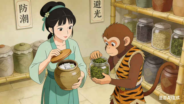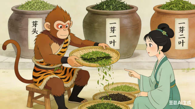 (四)茶姑抬眸,知是菩提引荐,推却不得,颔首道:“既为祖师所荐,便收你为徒。君山银针茶艺,藏制茶、泡茶两道真意,你问我答,记熟便学,心不诚则道不成。” 猴哥忙应:“弟子定当用心!”