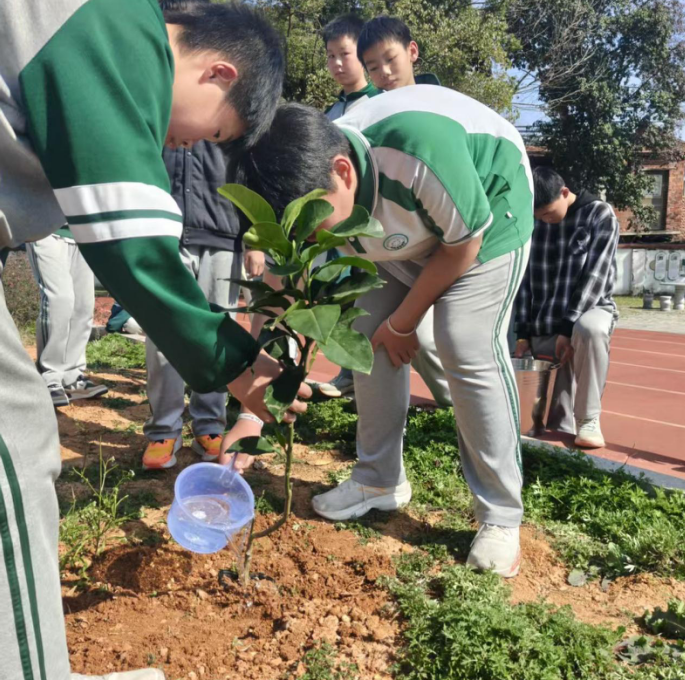接下来,同学们在班主任和劳动教育老师的指导下分组协作。大家手持锄头、水桶等工具,有的同学小心翼翼扶直树苗,确保根系舒展;有的同学挥锄培土,将泥土层层压实;还有的同学提着水桶,为新栽的树苗浇透定根水。杨校长和其他老师们手把手指导学生规范操作,叮嘱大家注意劳动安全,提高树苗成活率。阳光下,同学们的身影与嫩绿的树苗交相辉映,校园里处处洋溢着劳动的喜悦。