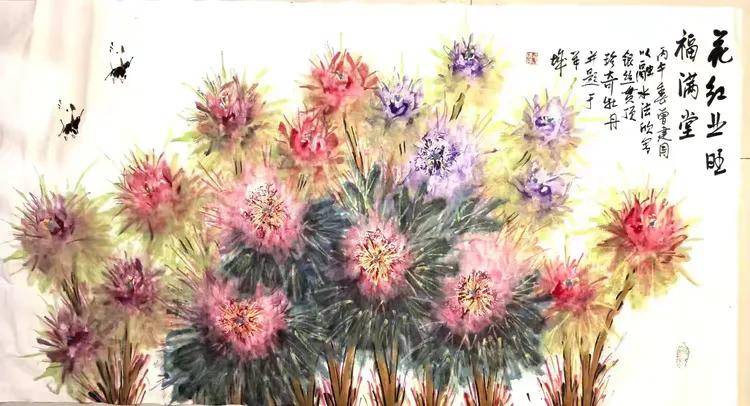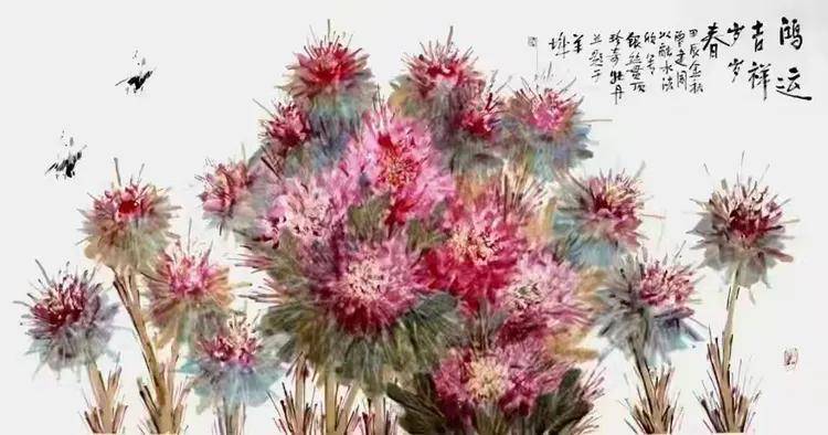 观其作品,花瓣如银丝般劲挺舒展,黄顶花蕊鲜活饱满,色彩晕染层次丰富却不杂乱,水痕流转间尽显自然天成之趣~