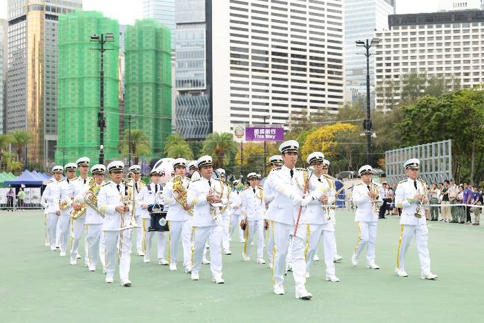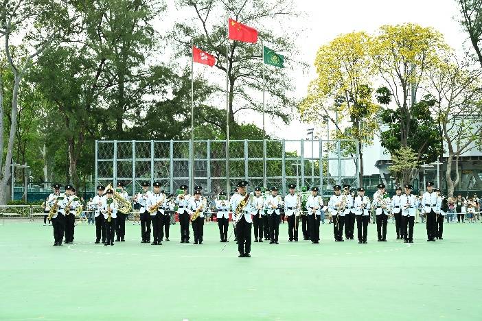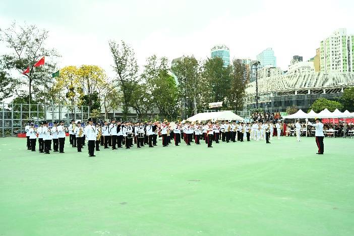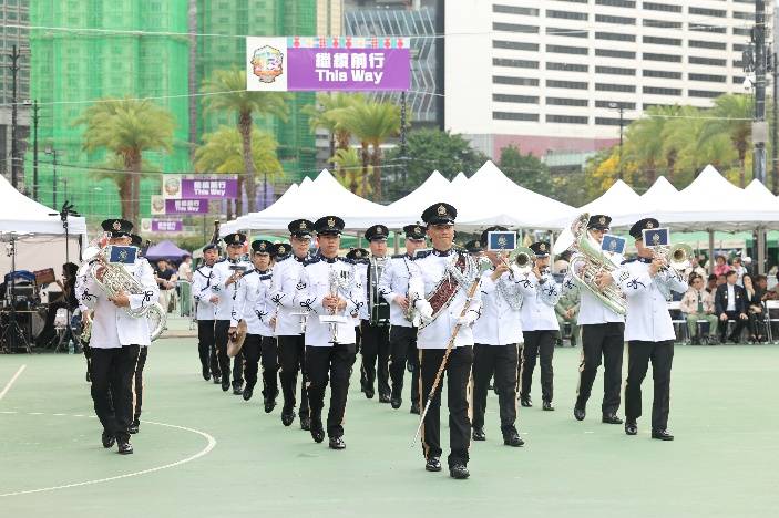 军乐汇演环节将活动气氛推向高潮。纪律部队乐队与香港童军乐队联合演奏,乐声铿锵有力,为典礼增添庄严而热闹的氛围。随后各乐队先后独立献技,赢得现场观众阵阵掌声与欢呼。