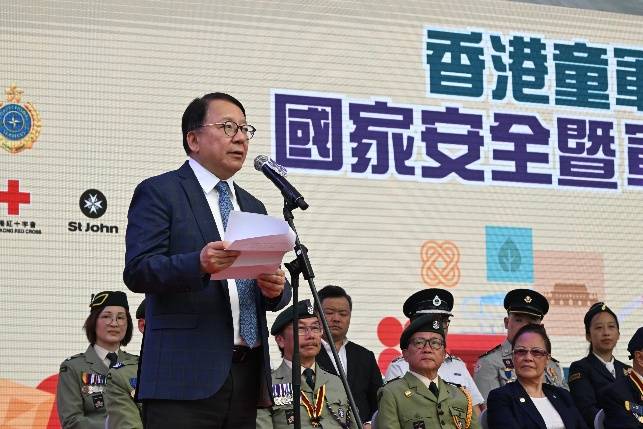 其后,由政务司司长陈国基致辞。他特别感谢总会的努力和付出,并对总会以节奏鲜明的军乐汇演配合多个互动摊位,以活泼、生动的方式把国家安全的讯息带给青少年的做法十分欣赏。他亦提到,总会是“共创明『Teen』计划”的重要策略伙伴之一,多年来凝聚青少年、促进他们成长、成才的工作,赢得社会各界的认同和支持。他指出,香港童军总会一直透过多元化的系统训练,帮助青少年学会独立、学会合作、也学会承担。近年,总会更重点推动国民教育活动,让成员深入了解国家的历史、文化与发展,培养家国情怀。这些工作,与特区政府培育爱国爱港、具备世界视野、有抱负和正向思维新一代的青年发展愿景,完全一致。
