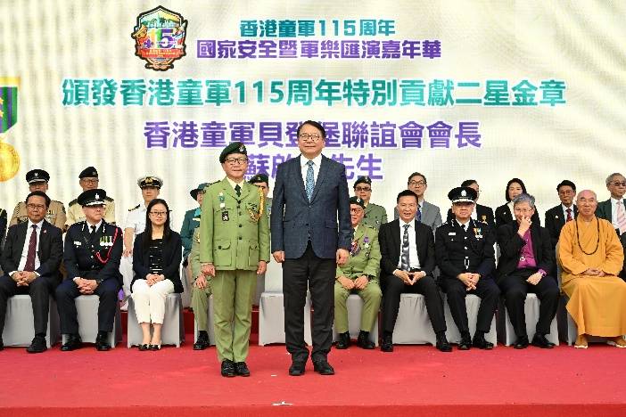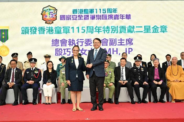 政务司司长陈国基随后颁发“香港童军115周年特别贡献二星金章”予两位全力支持115周年活动经费的童军成员——总会执行委员会副主席殷巧儿女士及香港童军贝登堡联谊会会长苏启明先生。其后,香港警务处处长周一鸣及入境事务处处长郭俊峯分别颁发“香港童军115周年特别贡献一星金章”,中央人民政府驻香港特别行政区青年工作部副部长万宁、中央人民政府驻香港特别行政区维护国家安全公署一局副局长谢志祥及香港惩教署助理署长何国文则分别颁发“香港童军115周年特别贡献金章”,表彰各界对童军运动的鼎力支持。