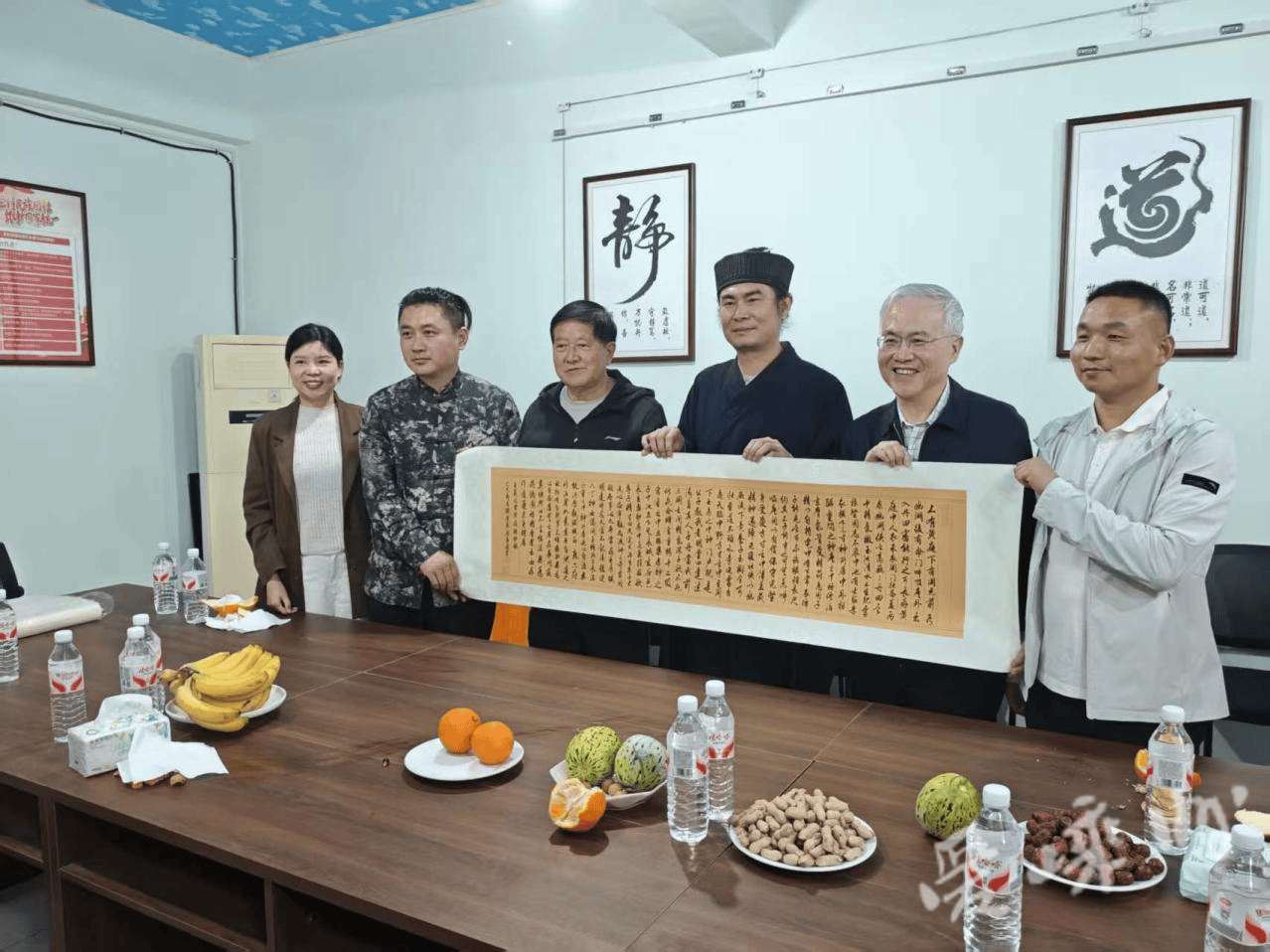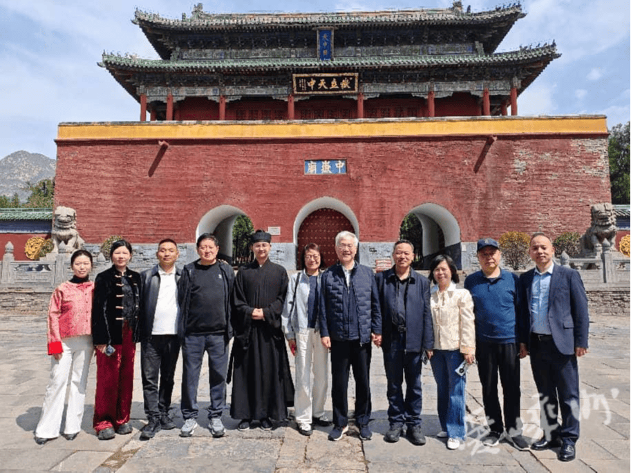 嵩山脚下,中岳庙古柏参天,碑碣林立,作为五岳之中规模最盛、保存最完整的道教古刹,藏着华夏文明的千年密码。山门高悬着汉东教授亲笔题写的“嶽立天中”金匾,鎏金大字庄重典雅,笔墨苍劲有神,与千年古刹交相辉映,成为中岳庙一道亮眼的人文景致。先生漫步青石古道,在001号国宝太室阙前久久驻足。两千年风雨剥蚀,阙身浮雕车马出行、神话百戏依旧清晰,勾勒出汉代社会的鲜活风貌。他轻抚石面,轻声慨叹:“这不是冰冷的石头,是活着的历史,是民族文化的根与魂。”随后与黄至杰方丈深谈文化保护,钱姓传承,赠以书画,笔墨之间,尽是对文脉传承的拳拳之心。
