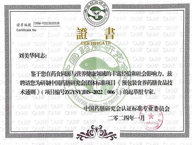 2024年1月,被聘请为研制中国药膳研究会团体标准项目起草组专家
