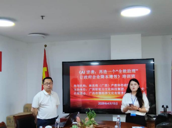 2026年4月15日下午,由林忠伟(广西)产教科咨政联盟作为指导机构,广西软实力文化科技集团、广西比干文化促进会与广西咨情经济文化有限公司主办的《AI逆袭:再造一个“全能助理”让政府企业降本增效》专题课程,在南宁金水湾大酒店十四层咨政联盟秘书处会议室成功举办。本次培训紧扣自治区党委政府“北上广研发+广西集成+东盟应用”的人工智能发展战略,以“小切口、大场景”为方法论,面向党政机关、基层政府、园区管委会、工商联、商会及企业骨干,开展了一场“带着问题来、拿着方案走”的AI应用实战集训。培训师韦良军以20余年党政企培训经验,将AI工具与政务、商务高频场景深度融合,参训学员涵盖南宁市青秀区、隆安县、统战系统、江苏商会、龙翔学校、社区卫生服务中心、制造企业等30余名代表。现场互动热烈、实操落地,学员普遍反映“听得懂、学得会、用得上”,为广西“人工智能+”行动在基层的推广普及提供了可复制的示范样本。