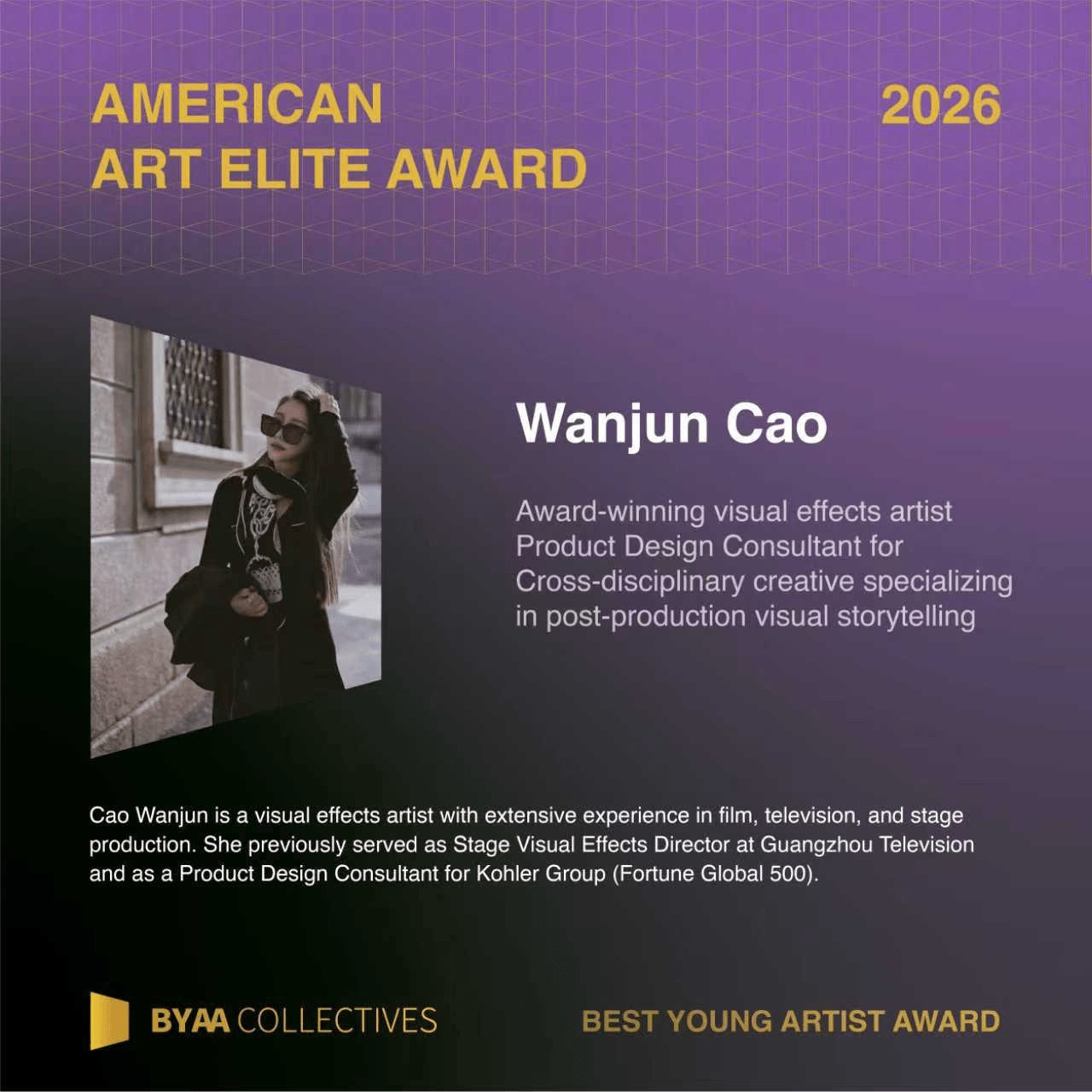 BYAA Collectives and American Art Elite Awards主要涵盖了视觉艺 术、音乐、舞蹈、电影、戏剧等多个领域,其评选标准除了会根据投递作品本身以外,同时也会综合考虑参选人在其领域的专业性。曹宛君曾参与过涵盖了舞台视觉设计、影视后期特效、当代装置艺术等多个维度,展现了极强的跨媒介创作能力与艺术把控力。同时,此次主要投递作品《The Ritual House》在后期视觉效果的专业性也得到了评委团的一致认可。评价其作品 “既拥有东方艺术的含蓄意境,又具备国际当代艺术的先锋表达,打破了地域与文化的边界,为视觉艺术的创新提供了全新的东方范式”。