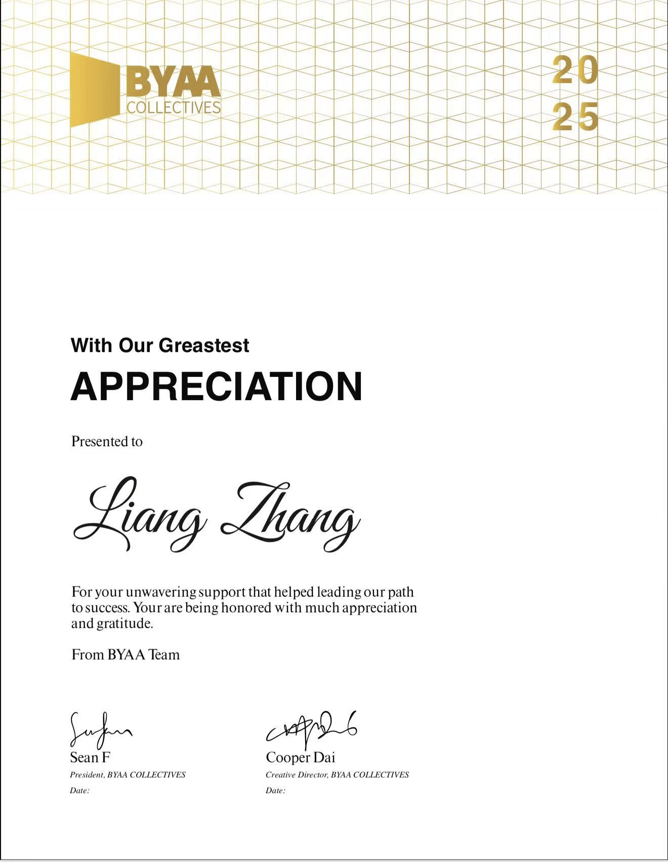 作为深耕国际艺术领域十余年的创作者,张亮长期致力于推动中美青年艺术的交流与发展。她深度参与赛事评选体系的搭建,尤其注重发掘兼具民族文化底蕴与国际视野的华人青年创作者,为中国青年艺术家搭建通往国际艺术舞台的专业通道。 张亮表示,非常荣幸可以在该国际比赛中担任评选工作,此次比赛涵盖了视觉艺术、音乐、舞蹈、电影、戏剧等众多艺术领域,其评选标准除了参选人所投递的作品本身以外,也对参选人在其领域的专业性进行综合考虑。值得一提的是,BYAA Collectives and American Art Elite Awards为了保证评选的专业行,所有审团成员均来自相关领域的重要知名艺术家,以专业、严谨、包容的评审态度完成所有评选工作。