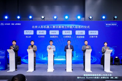 围绕朝阳区推进智能机器人“一园两基地”建设规划,大会同步发布产业载体建设进展。在北京人形机器人赛训基地方面,北京深蓝智能机器人研究院、iCANX全球科学平台、北京加速进化科技有限公司、亚太机器人世界杯国际理事会、万境千寻(北京)科技有限公司入驻赛训基地工作室并现场签约。该基地聚焦人形机器人赛事举办、测试训练、技术交流与成果展示,并启动“熊猫眼”配套提升工程,建设专属工作室,搭建产业链协同平台。
