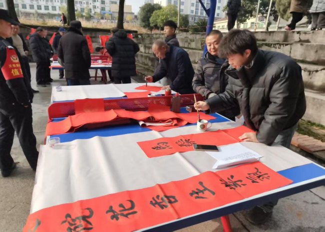 与此同时,写春联活动在另一侧同步展开。书法爱好者们齐聚书写台前,挥毫泼墨,笔走龙蛇。一幅幅充满吉祥寓意、风格各异的春联在红纸上跃然而出,将新春祝福凝聚于笔墨之间,现场墨香四溢,年味十足。