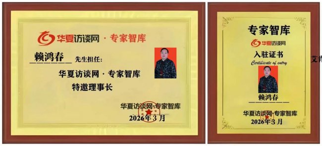 2025年10月《非遗中国说》大型技艺传承纪录片访谈组委会授予赖鸿春“非遗技艺传承典范人物”荣誉!#讲好非遗故事#建设文化强国#,并由北京科学教育电影制片厂、 《非遗中国说》大型技艺传承组录片访谈主委会制作、中央新闻纪录电影制片厂(集团)出品的《非遗中国说--赖鸿春》,在《非遗中国说--赖鸿春》阐述了"中医非遗精神与现代商贸结合"的思维;还将其事迹载入《非遗风云人物》年鉴(2025年)及大型国家历史文献编委会主编的《奋进中国新征程》。