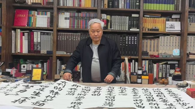 观先生挥毫全程,我深深体会到何为敬畏、何为严谨、何为传承。先生以耄耋之身,怀赤子之心,对伟人尊崇备至,对笔墨敬畏有加,这份风范与品格,堪为我辈终身楷模,亦让我对书法之道、为人之理,有了更为深刻的感悟。(蔡建花)